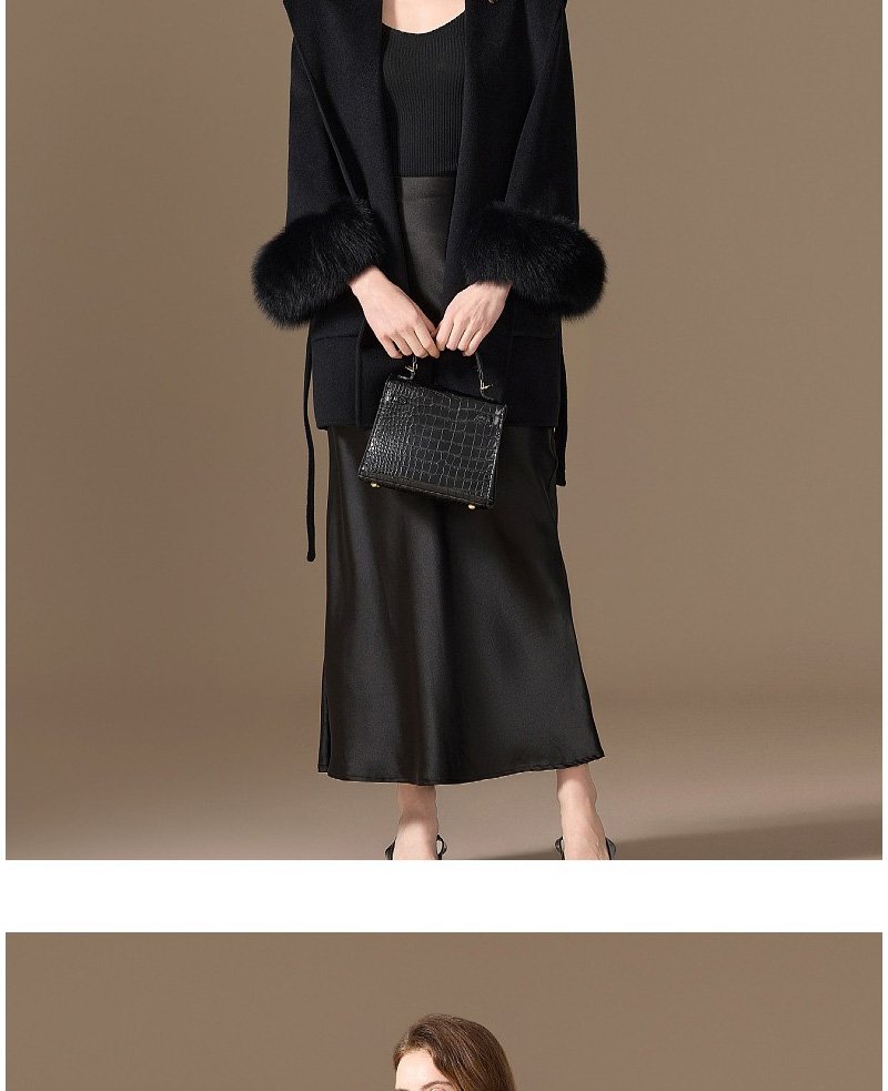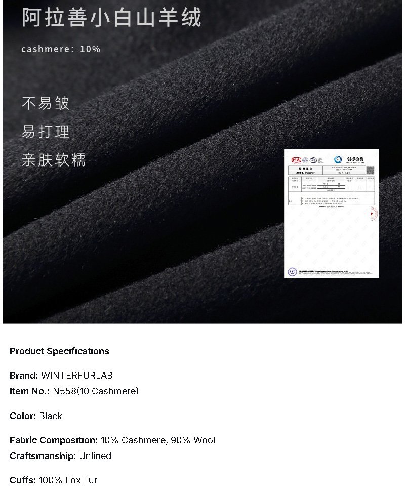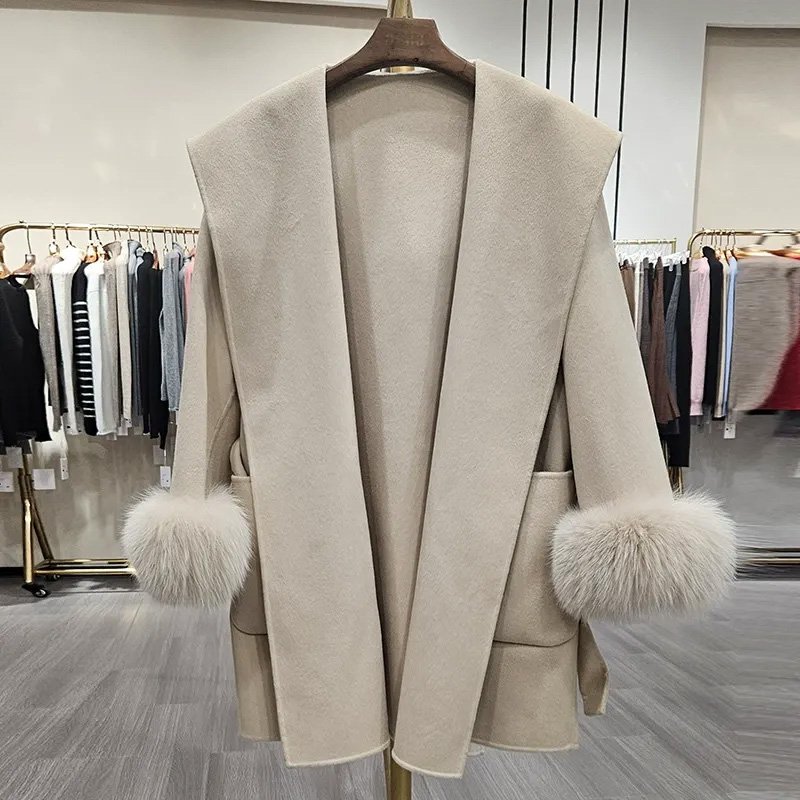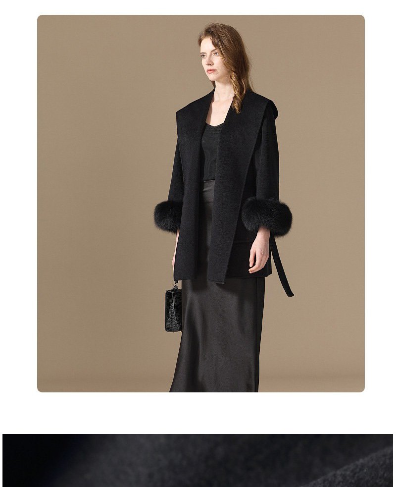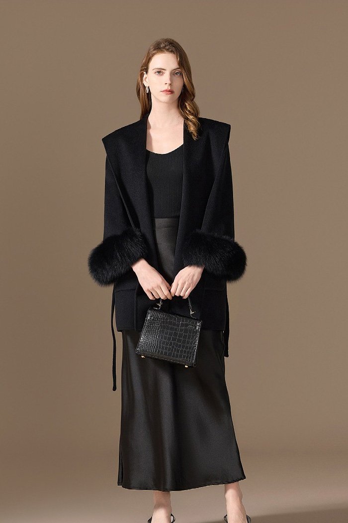 10% Cashmere / 90% Wool Hooded Short Coat – Fox Fur Cuffs (Women’s)