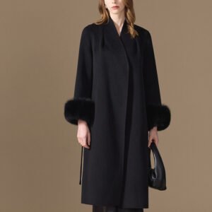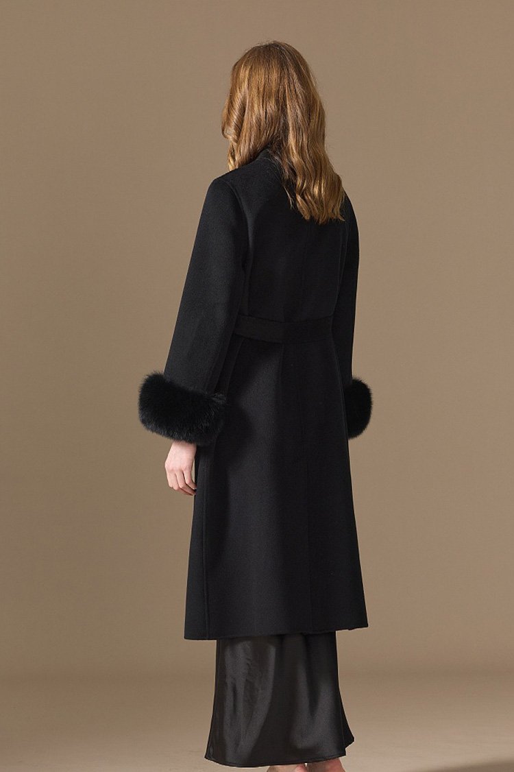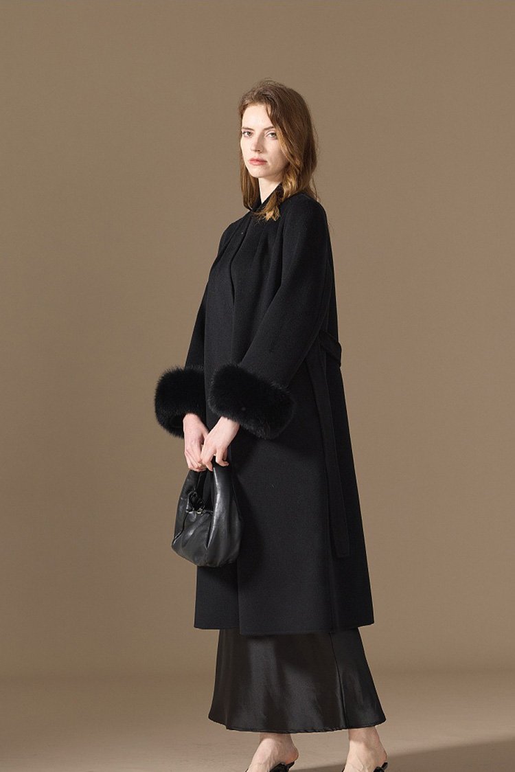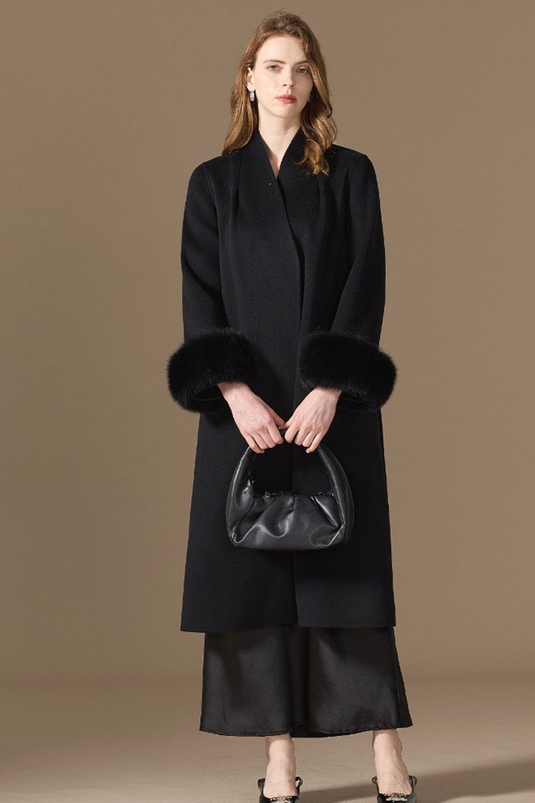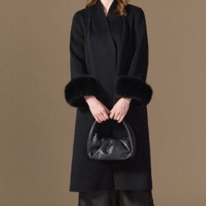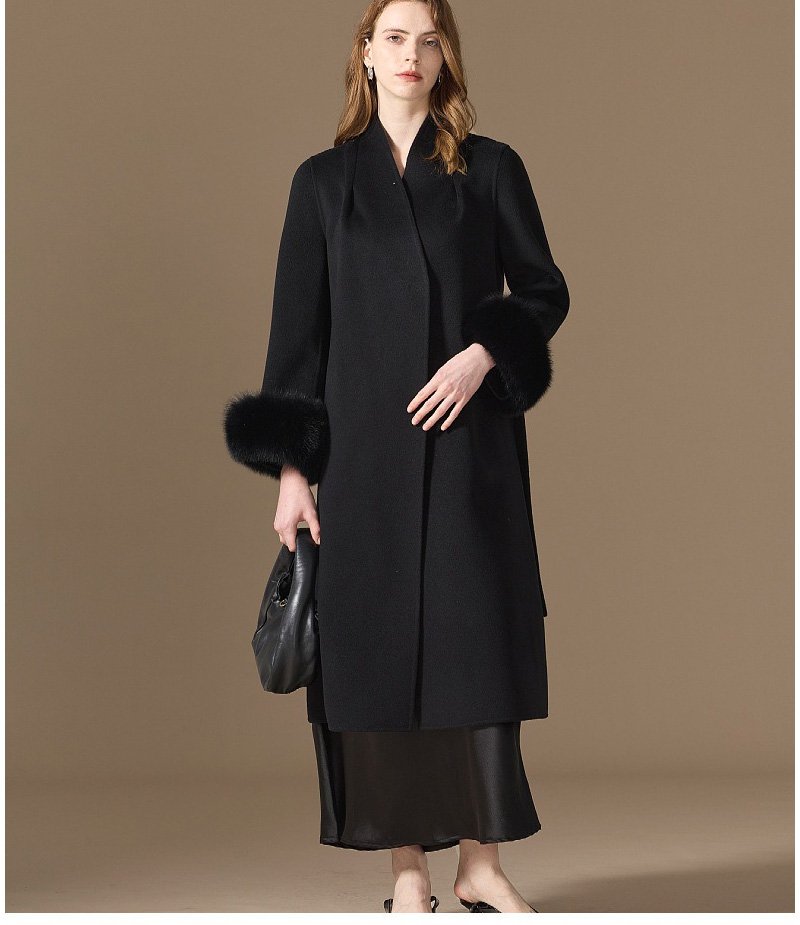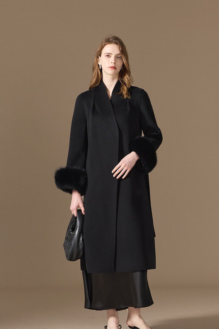 100% Cashmere Women’s Coat 2025 Winter New Arrival Solid Cashmere Collarless Wool Coat with Fox Fur Cuffs