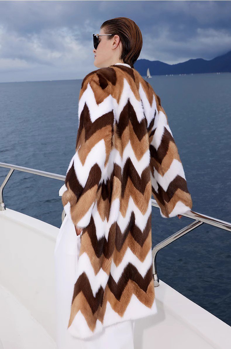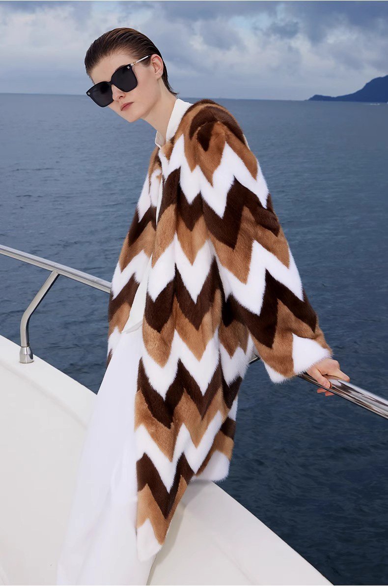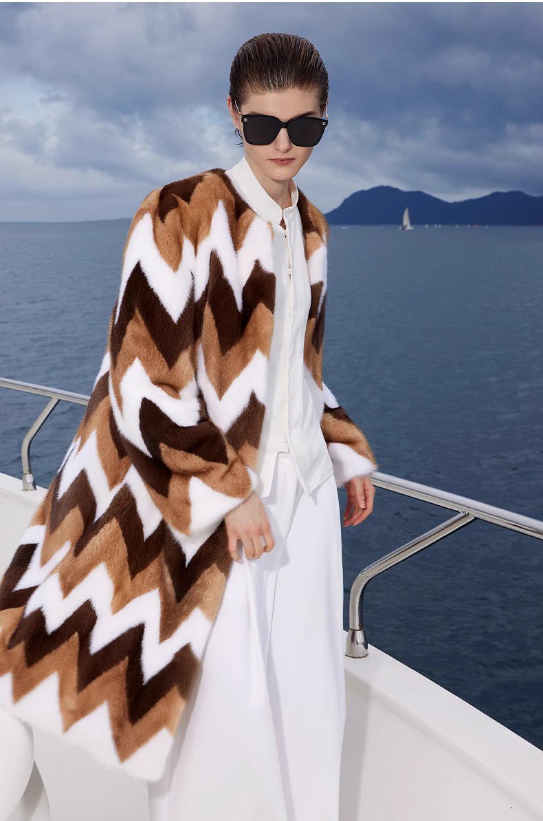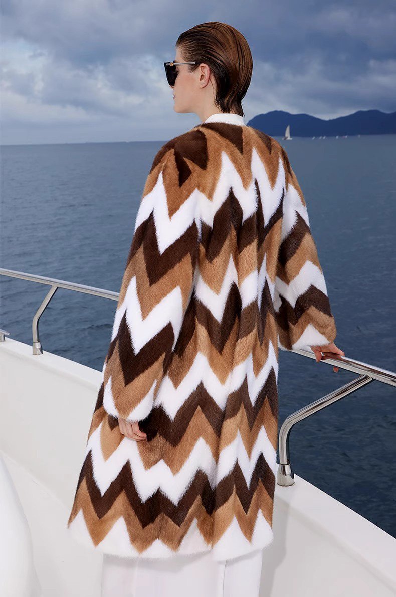 Women’s Mink Fur Coat 2025 – Geometric Wave Pattern, Hand-Inlaid Luxury Design